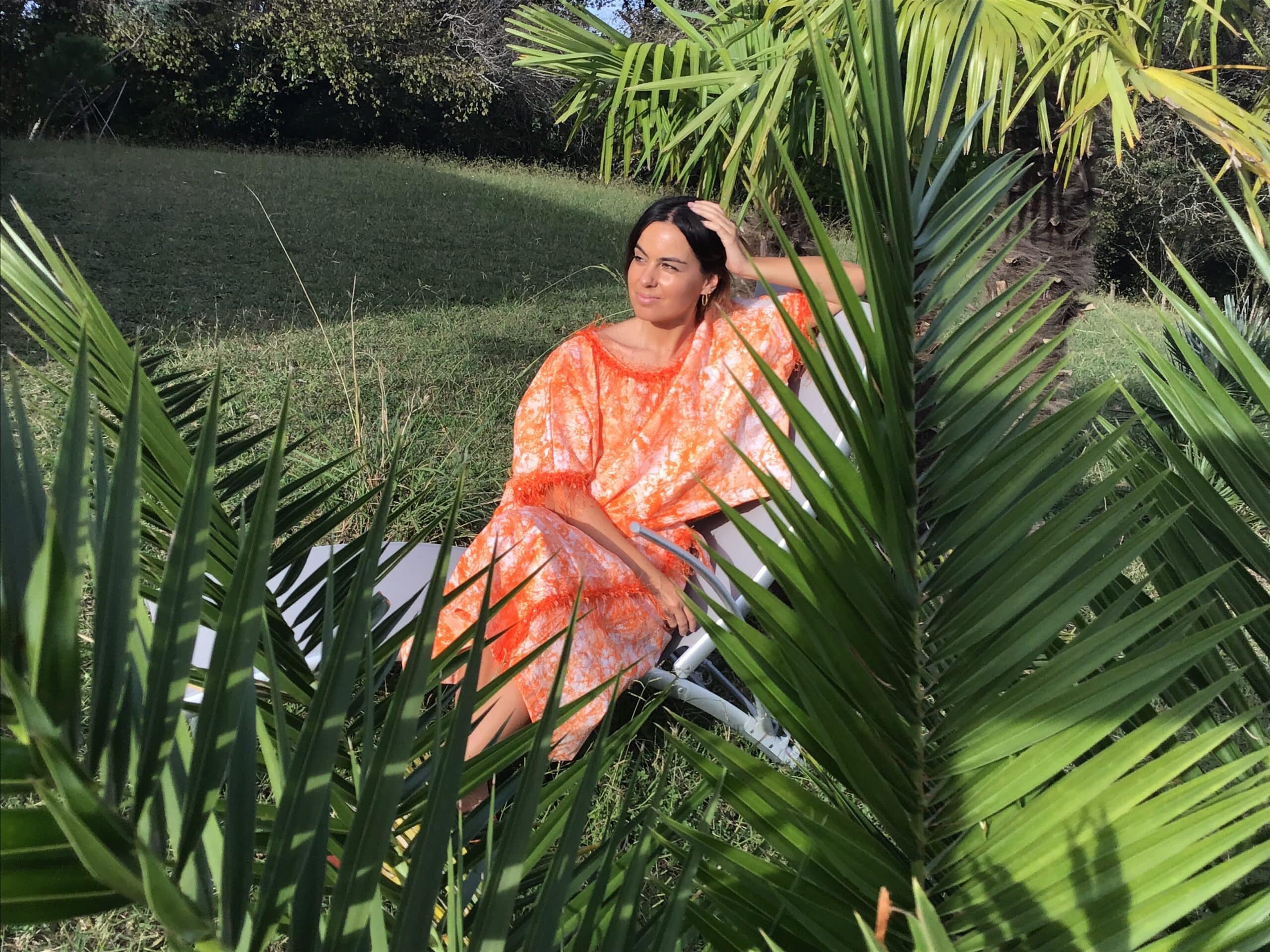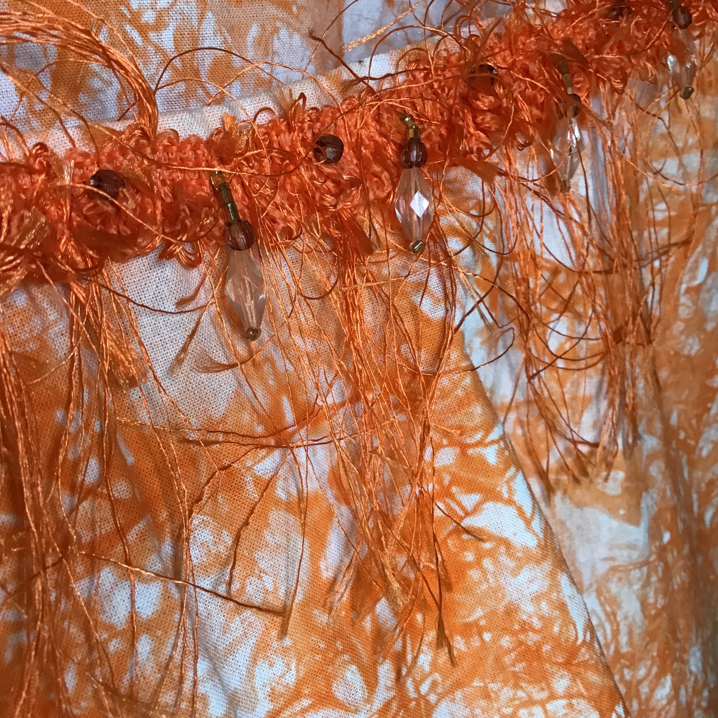 trimmed with pearls and feathers